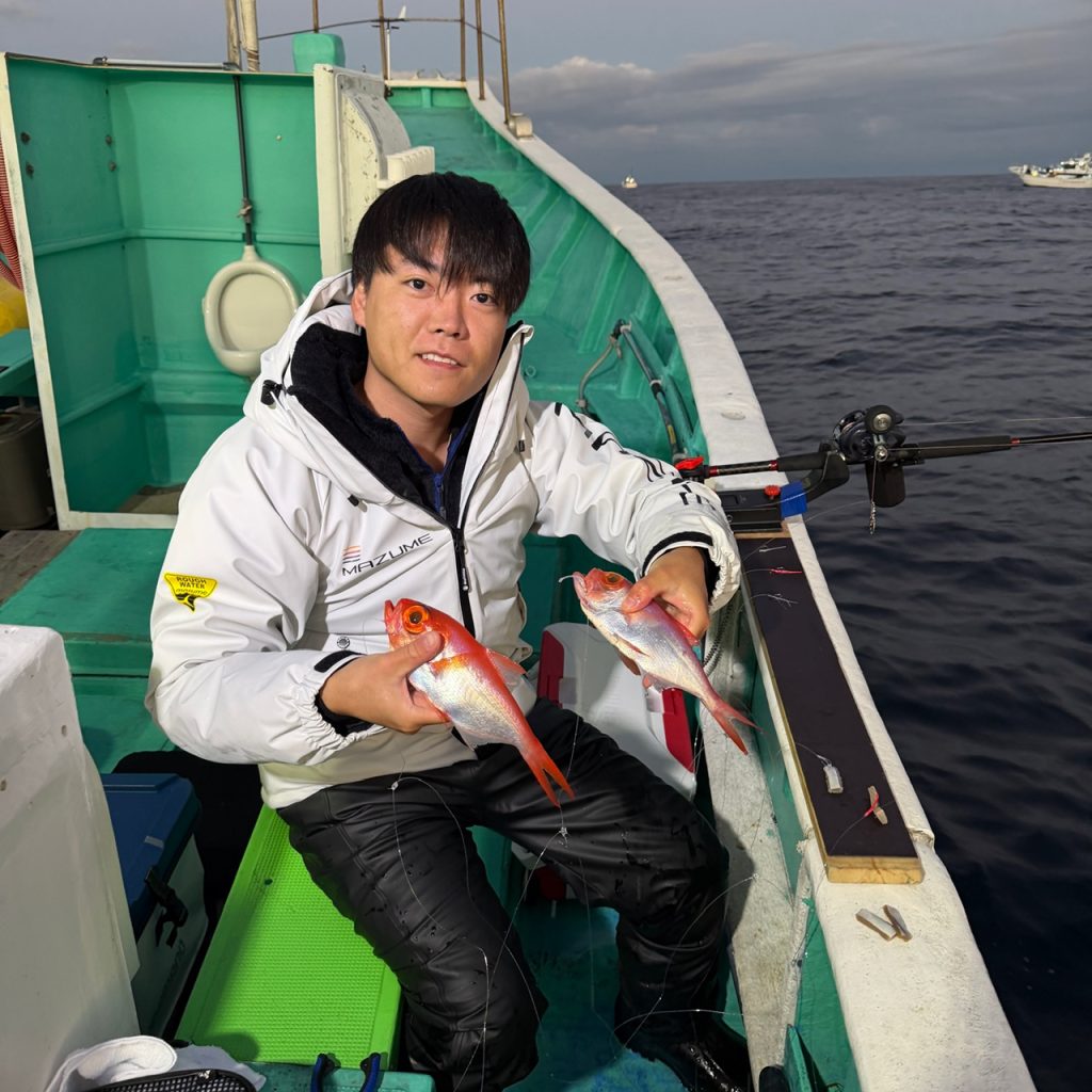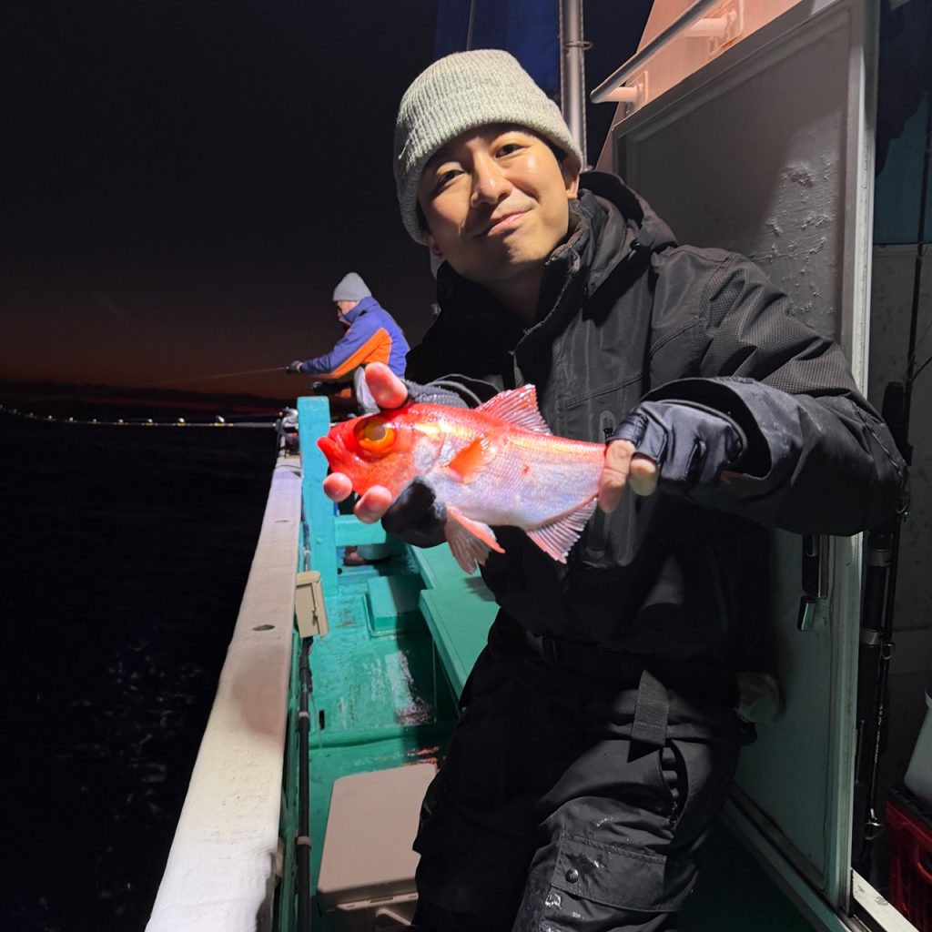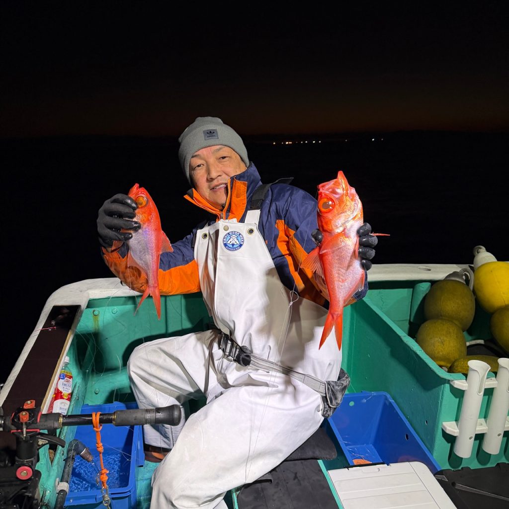 半夜ムツ、キンメ 2025年11月29日 最終更新日時 : 2025年11月29日 三五八丸管理者 本日も夜便へ出船。久々のベタナギ!しかしムツの反応が有っても喰わない!キンメの良い群れも2度程。釣果はムツ1〜8、キンメ14〜28。お土産になりました。最近夜便がちょっと不調気味ですが、是非遊びに来て下さい〜 明日はヤリイカで出船します。