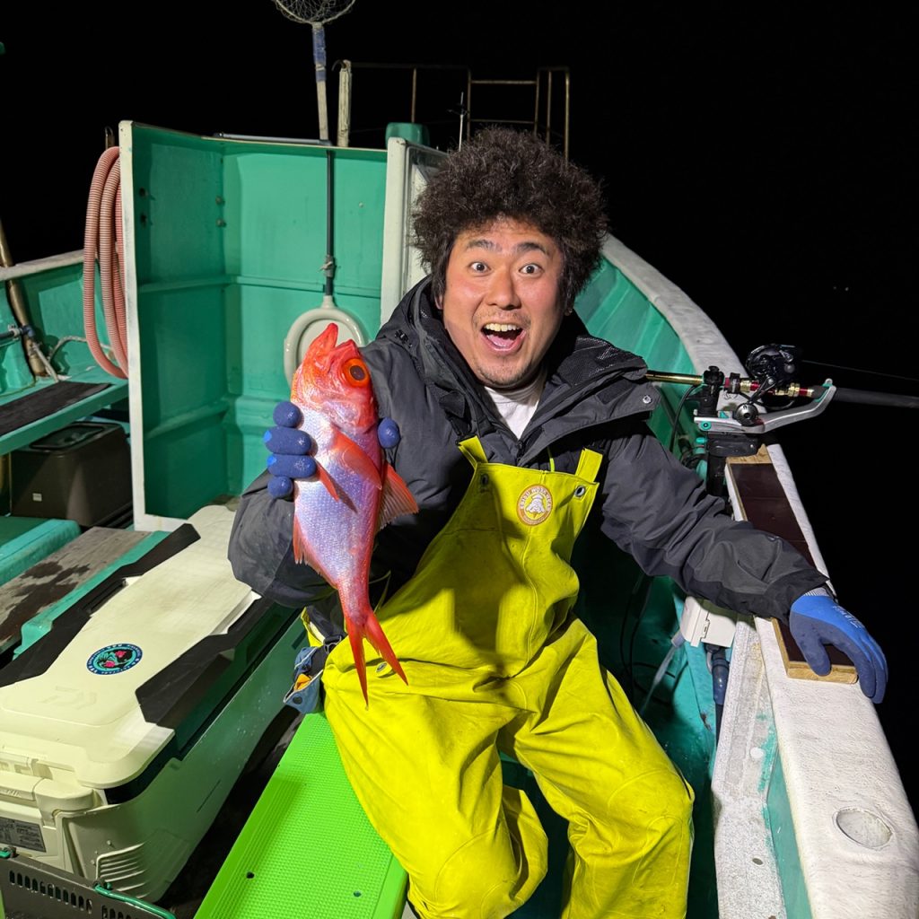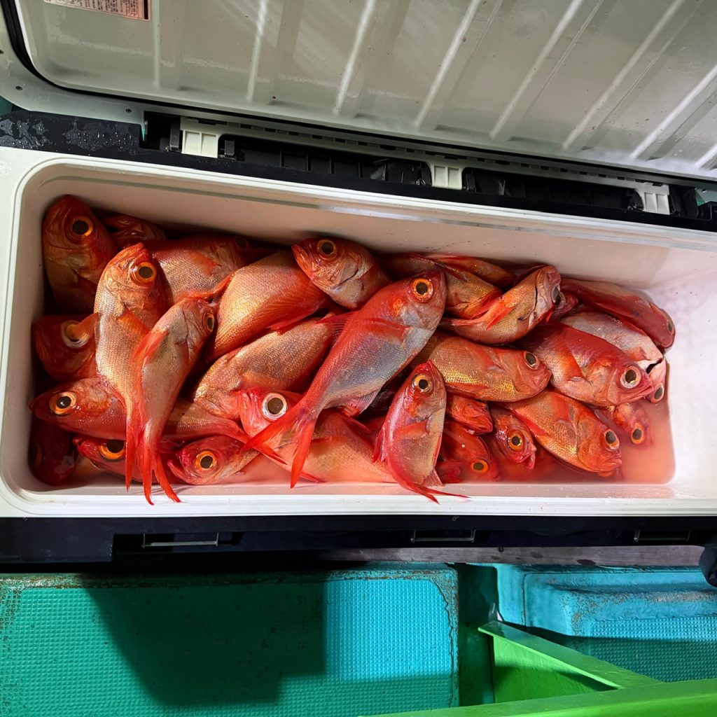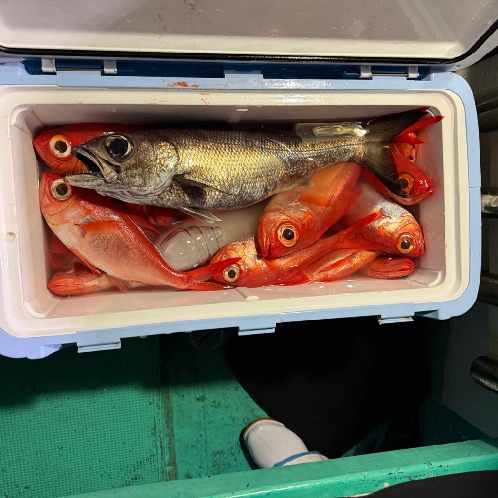 本日は半夜便で出船して来ました。海はナギでしたが潮型が悪く一投目はオマツリ!次からキンメの良い反応が!その後パクパクが続き規定量の方も。最後にデカムツが上り竿納め。皆様お土産十分でした。