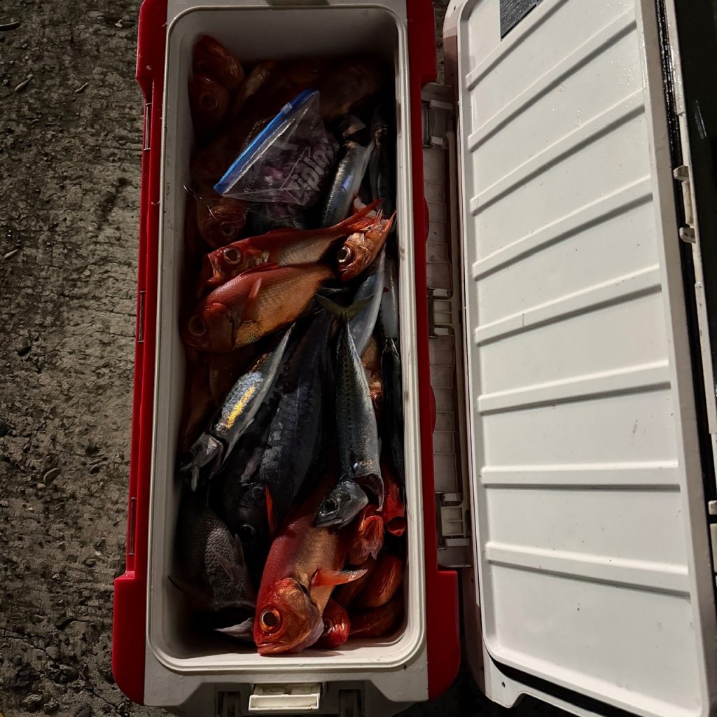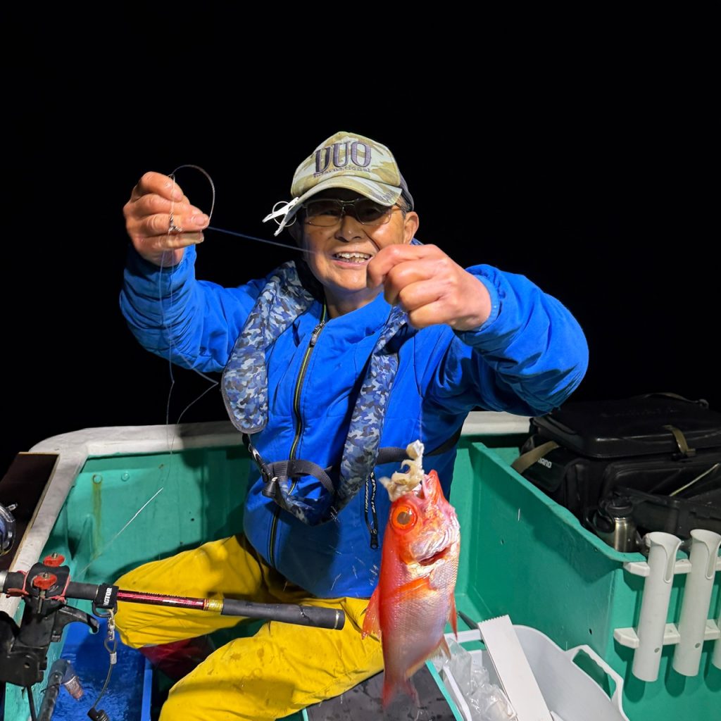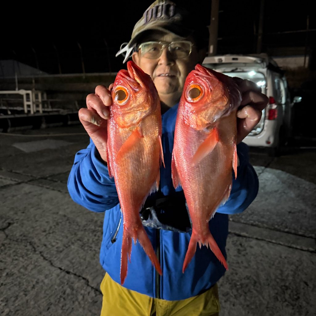 本日は半夜ムツ、キンメへ出船。波、風の心配が有りましたが出てみると意外と海悪くなく潮も早く無く良かったです。始めのうちムツ、その後キンメの群れが続き、ひと流しで終了。釣果はムツ15〜18、キンメ定量。今年は潮が良いので是非半夜ムツ、キンメへお越し下さい〜